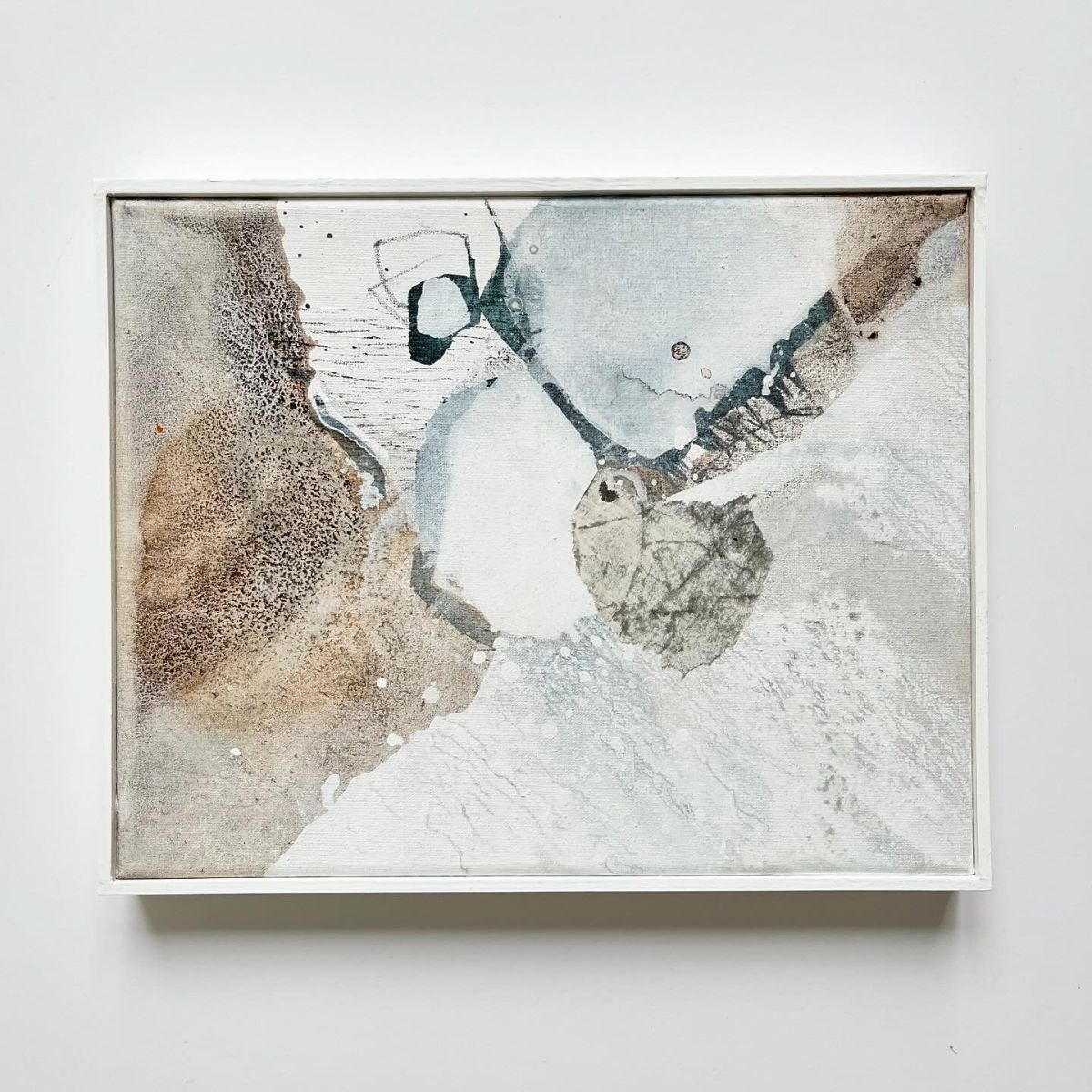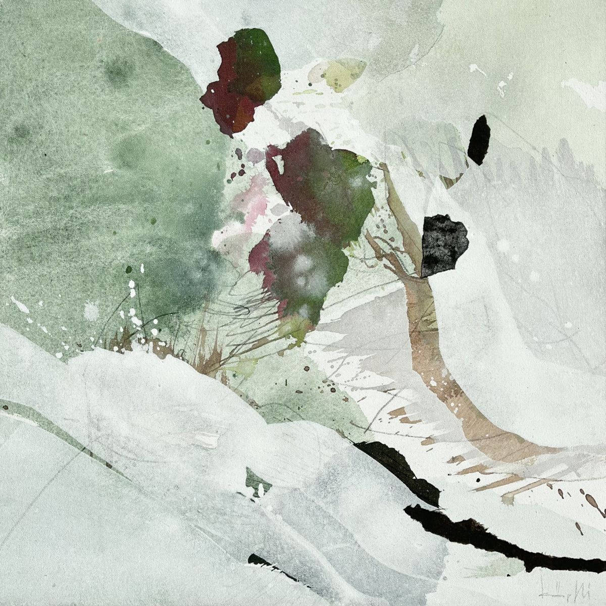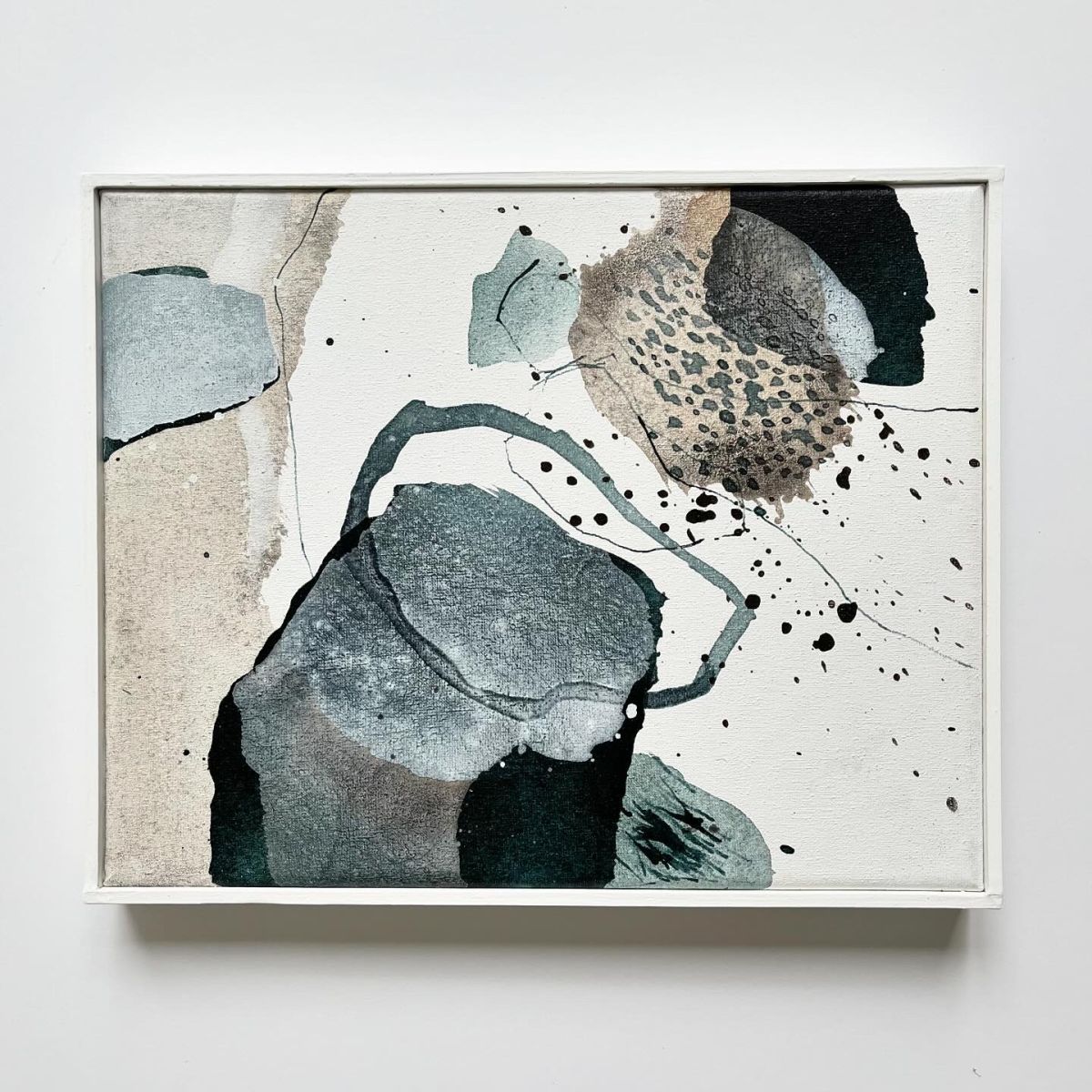 Die Farbigkeit der Steine aus dem Maggiatal - ein gebrochenes grün-blau, weiss mit Silberglitzer - in Kombination mit leichten Brauntönen hat mich zu einer Bilder-Trilogie animiert. Eine Spielerei mit Farbe, Fläche, Linie & Struktur.