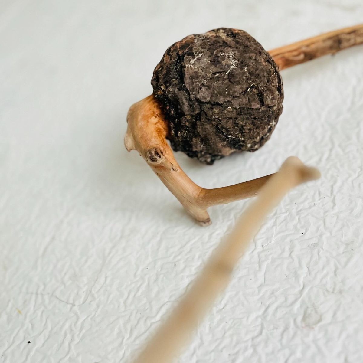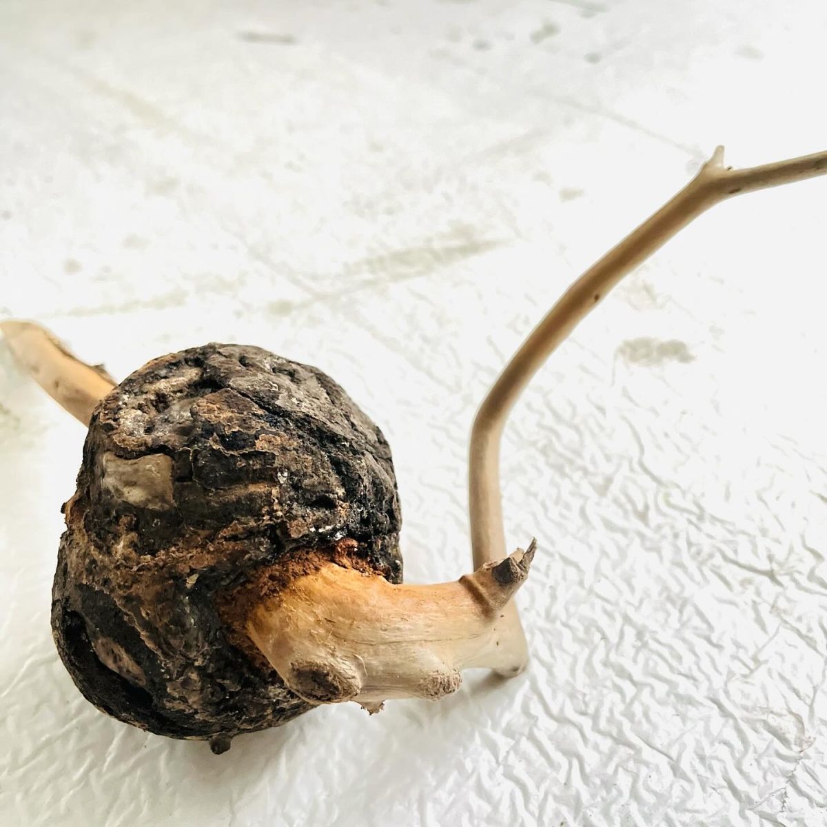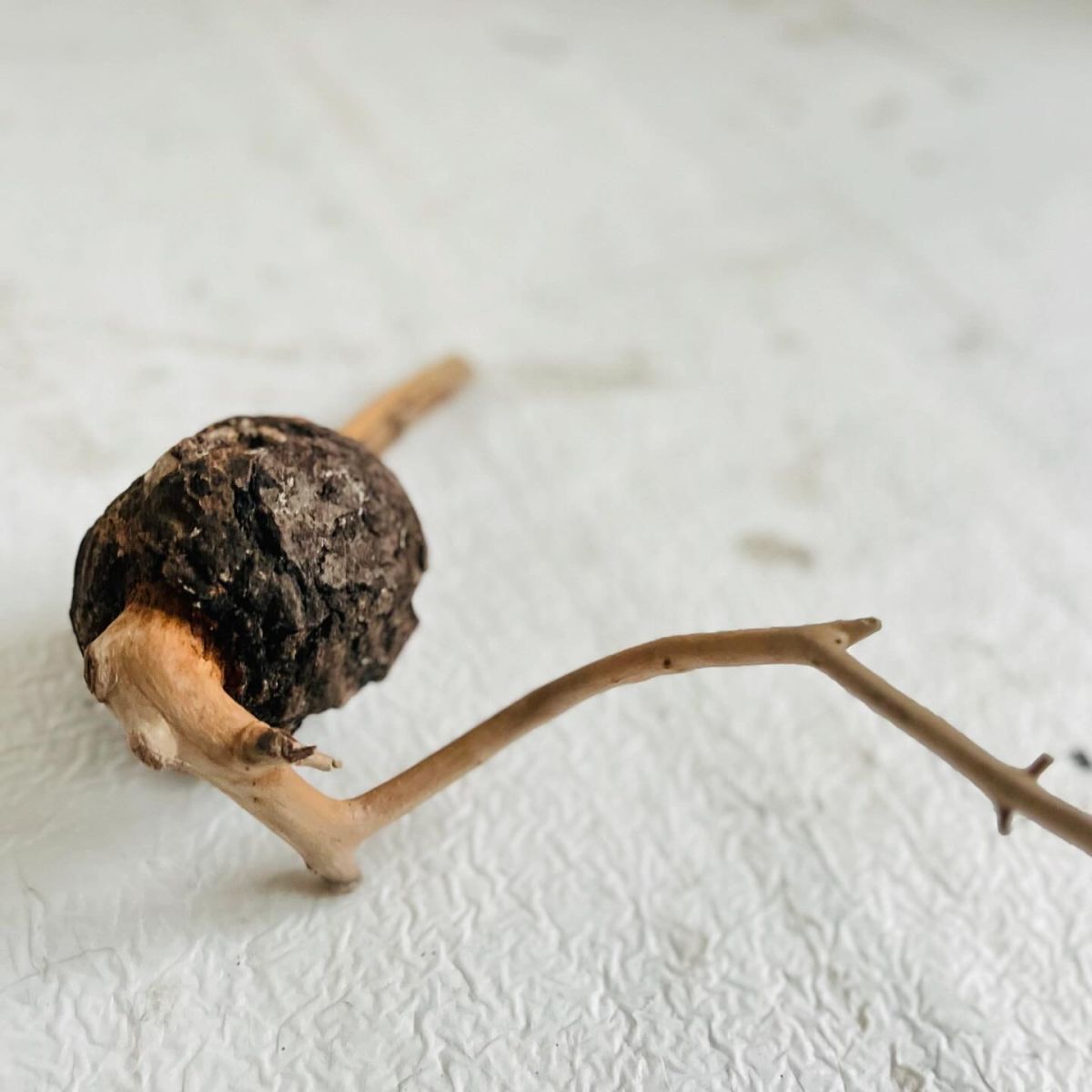 Kugelige Wulst am blanken Holz. Von schmalem Ast durchbohrt. Gewichtig, wichtig, rund ein Pfund! Ein sogenanntes „blank-durchbohrtes Wulstkugelpfund“.