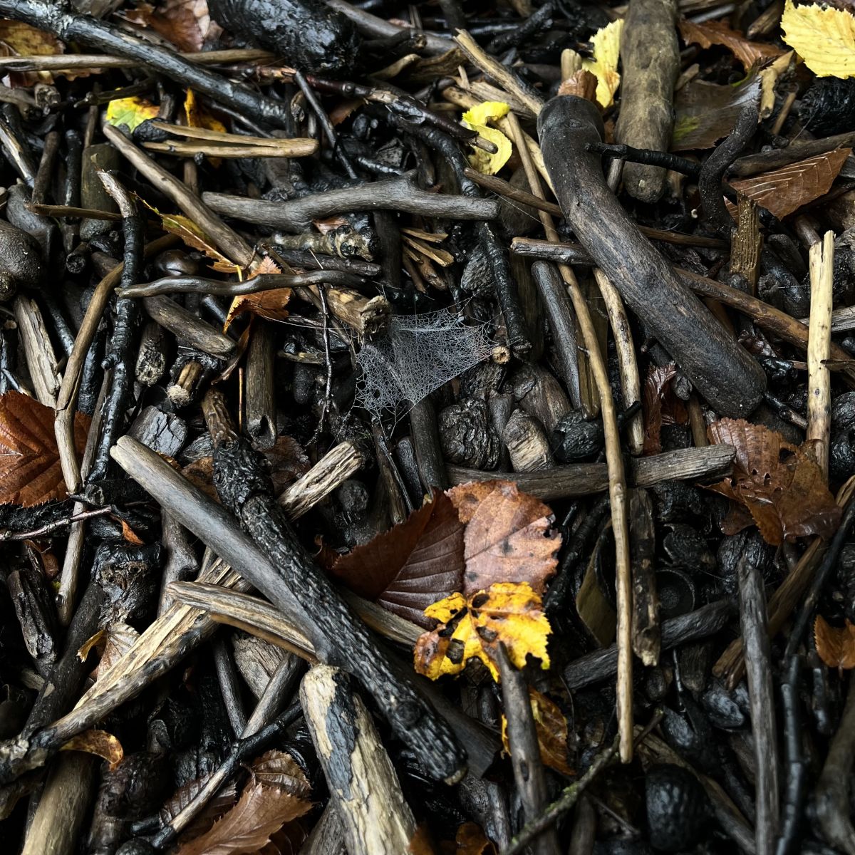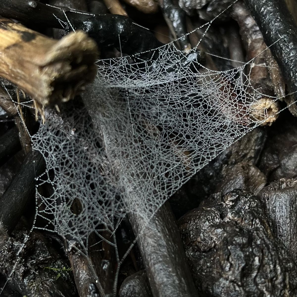 Inmitten von kleinen, dunkelglänzenden Schwemmholzstücken hat jemand Grossartiges gebaut. Feinste silbrigschimmernde Fäden, ein Liniengespann mit Mini-Tautropfen, wie Perlen aufgereiht auf einer Schnur. Ist dies nicht ein wahres Kunstwerk?