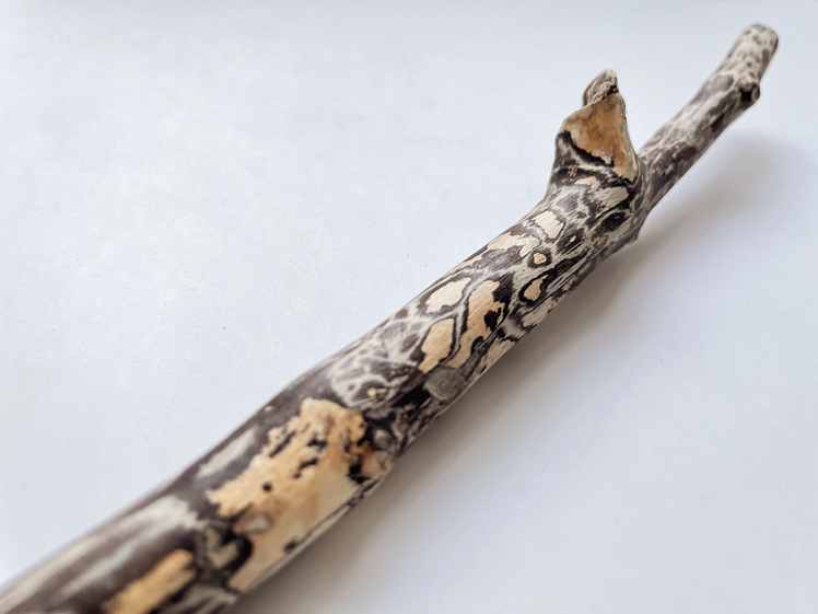 Nicht bearbeitet, nicht geschliffen, genau so lag dieser Ast mit diesem faszinierenden Muster in einem Haufen von Schwemmholz. Zu wem gehört wohl diese Signatur?